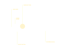 Thanks to the non-existent display, only a small battery is required. The ON/OFF button is placed on the side. The protruding sound buttons can each be assigned with different tones. The DRUMS wristband shown here has a large BASE DRUM with matching SNARE/HI-HAT and other buttons for different sounds. The whole armlet is coated with a water resistant nylon fabric.