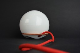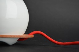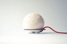 Is a table lamp which changes its appearance by switching on the light. The outside surface of the porcelain globe is smooth and glazing whereas the inside is filled with small hollow spaces. As a result the sleek surface turns translucent and the spaces illuminate the globe from the inside. That effect was caused by small cork pieces, which completely dissapeared in the burning process of the porcelain.